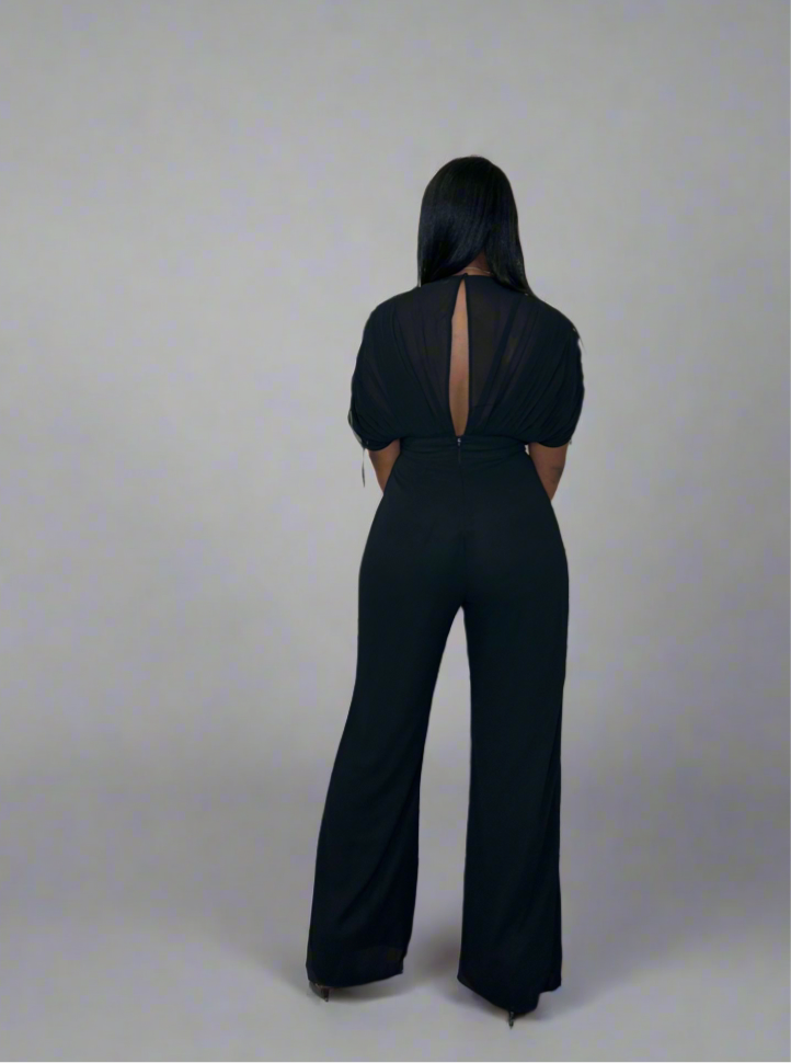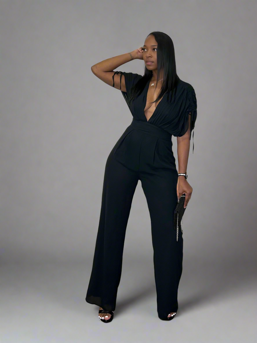 Super gorgeous, chiffon pleated jumpsuit with ruched sleeve detail, V-neck and full lining.